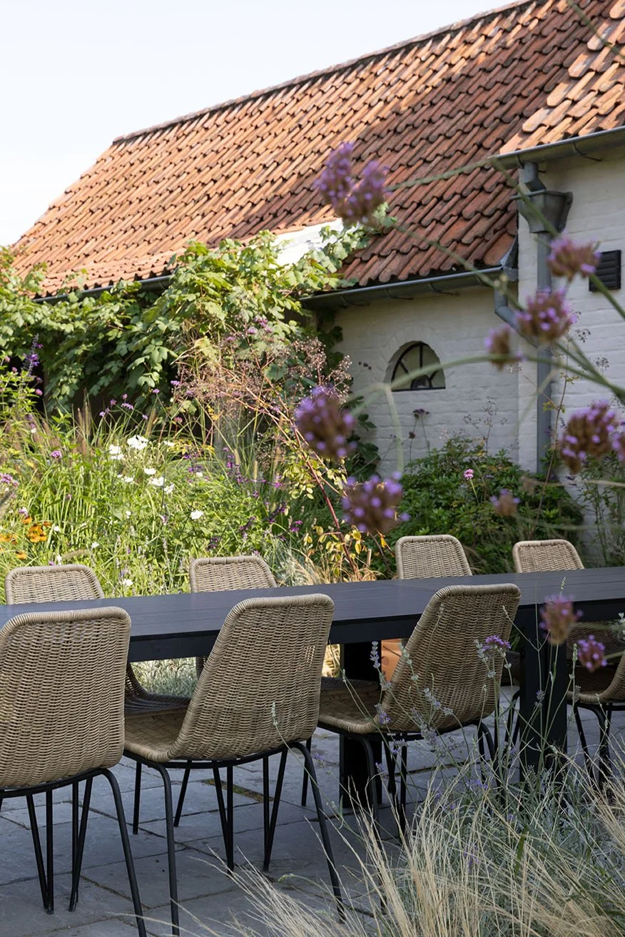grote wilde bloementuin met zonnig terras, Bbq en vuurschaal